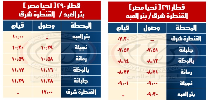 - قطار 291: ينطلق من محطة القنطرة شرق في الساعة 07:30 ويصل إلى محطة بئر العبد في الساعة 09:30، ويعمل بتركيب 4 عربات تحيا مصر.