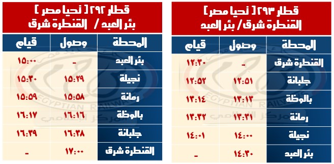 - قطار 293: يبدأ رحلته من محطة القنطرة شرق في الساعة 12:30 ويصل إلى بئر العبد في الساعة 14:30، بتركيب 4 عربات تحيا مصر.