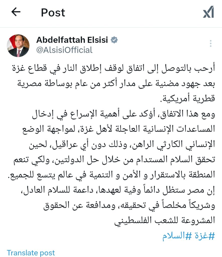 رحّب الرئيس عبدالفتاح السيسي، رئيس الجمهورية، بالتوصل إلى اتفاق وقف إطلاق النار في قطاع غزة، مشيدًا بالجهود التي استمرت على مدار أكثر من عام بوساطة مشتركة بين مصر وقطر والولايات المتحدة.