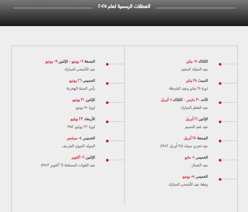 - إجازة شم النسيم: يوم الاثنين 21 أبريل 2025.