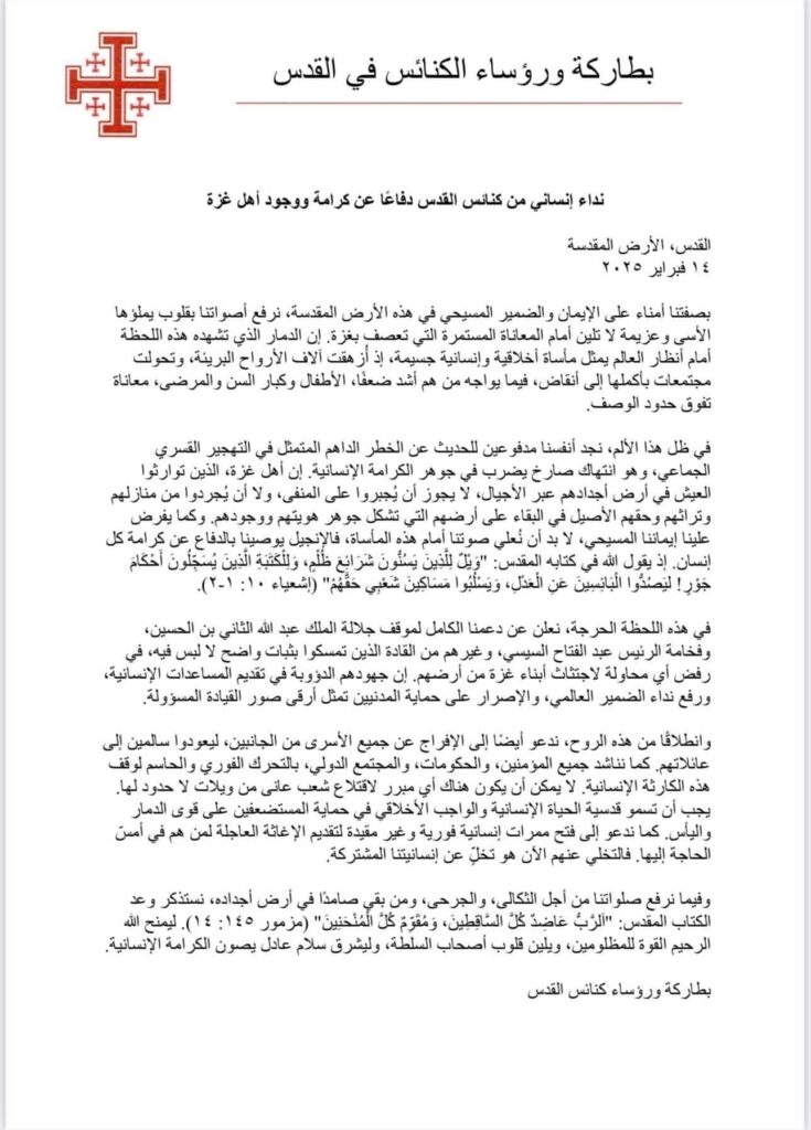 كما رفض رؤساء الكنائس بالقدس بشكل قاطع لما وصفه بـ”الخطر الداهم” المتمثل في “مقترحات التهجير القسري الجماعي” للفلسطينيين في غزة. واعتبر أن مقترح التهجير اعتداء مباشر على الكرامة الإنسانية وحقوق الإنسان الأساسية.