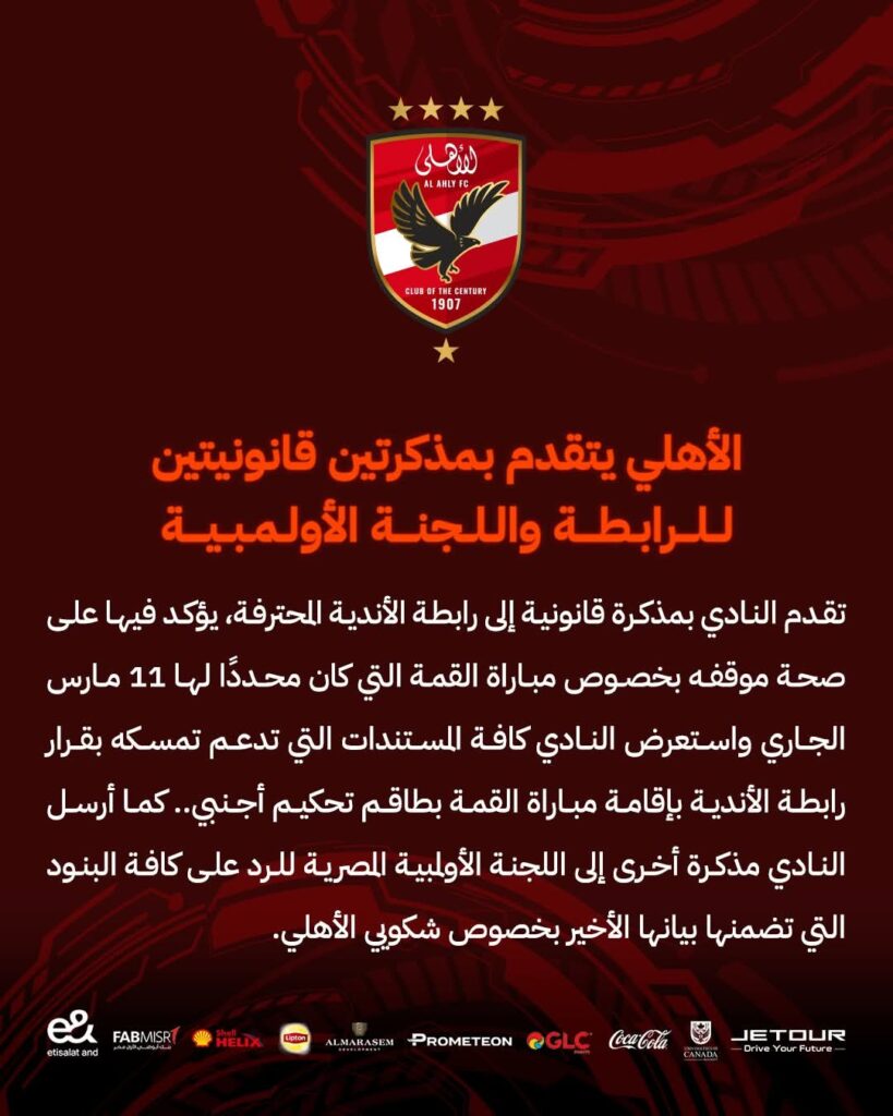 في إطار حرصه على الدفاع عن حقوقه، تقدم النادي الأهلي بمذكرتين قانونيتين، إحداهما إلى رابطة الأندية المحترفة يؤكد فيها على سلامة موقفه بخصوص مباراة القمة التي كان مقررًا إقامتها يوم ١١ مارس الجاري. كما استعرض النادي في مذكرته كافة المستندات التي تعزز موقفه، مشددًا على ضرورة الالتزام بقرار الرابطة القاضي بإقامة المباراة بطاقم تحكيم أجنبي.