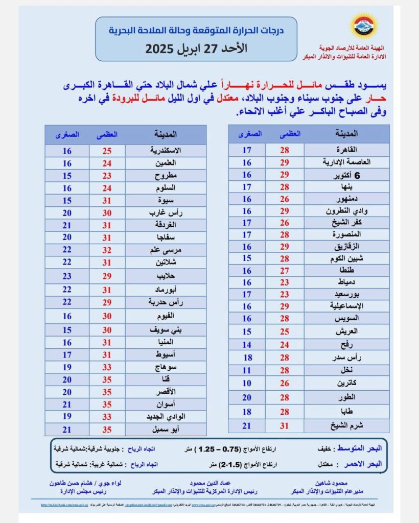 - الطقس النهاري: مائل للحرارة على القاهرة الكبرى والوجه البحري وشمال الصعيد، معتدل على السواحل الشمالية، وحار على جنوب سيناء وجنوب الصعيد.