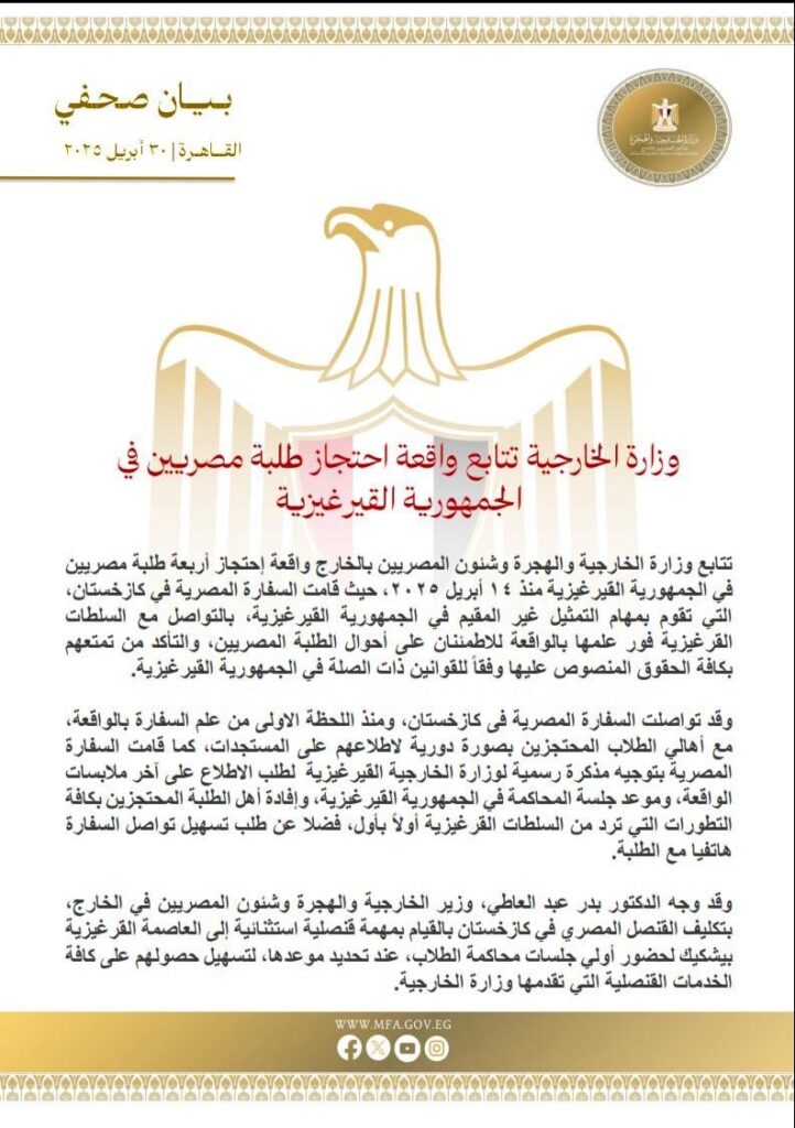 أصدرت وزارة الخارجية والهجرة وشؤون المصريين بالخارج بيانًا حول متابعة قضية احتجاز أربعة طلبة مصريين في جمهورية قرغيزستان منذ 14 أبريل 2025.