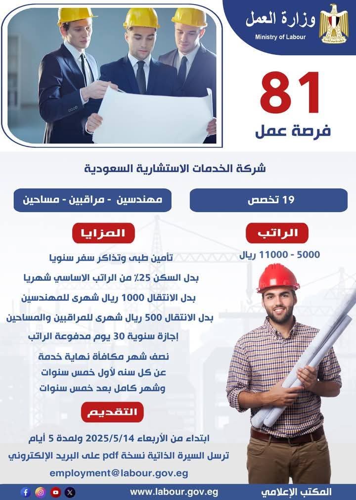 أعلن وزير العمل محمد جبران اليوم الأربعاء 14 مايو 2025 عن توفير 81 فرصة عمل للكوادر المصرية المؤهلة في القطاع الهندسي بشركة الخدمات الاستشارية السعودية، وذلك بالتنسيق بين مكتب التمثيل العمالي المصري بالرياض والإدارة المركزية للعلاقات الدولية.