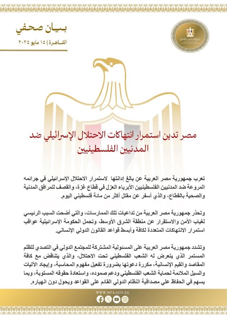 أعربت جمهورية مصر العربية عن إدانتها الشديدة لاستمرار الاحتلال الإسرائيلي في ارتكاب جرائم ممنهجة ضد المدنيين الفلسطينيين العزل في قطاع غزة، بما في ذلك القصف العنيف للمرافق المدنية والصحية، والذي أسفر عن سقوط أكثر من مئة شهيد فلسطيني اليوم وحده.