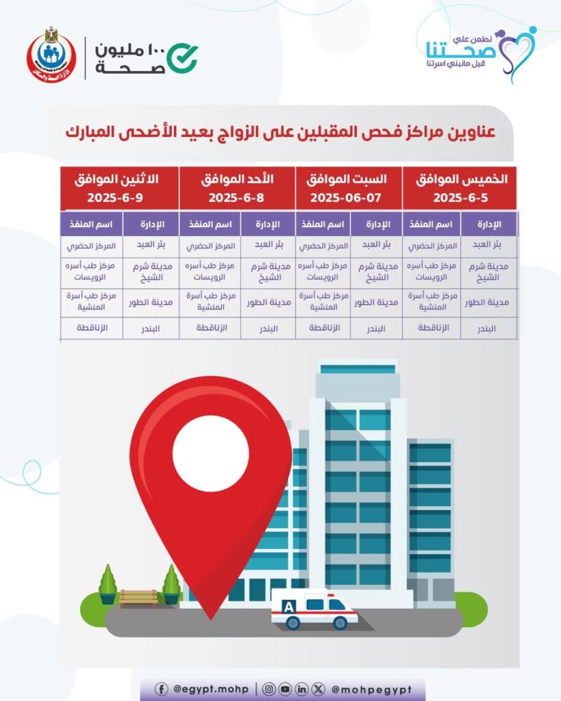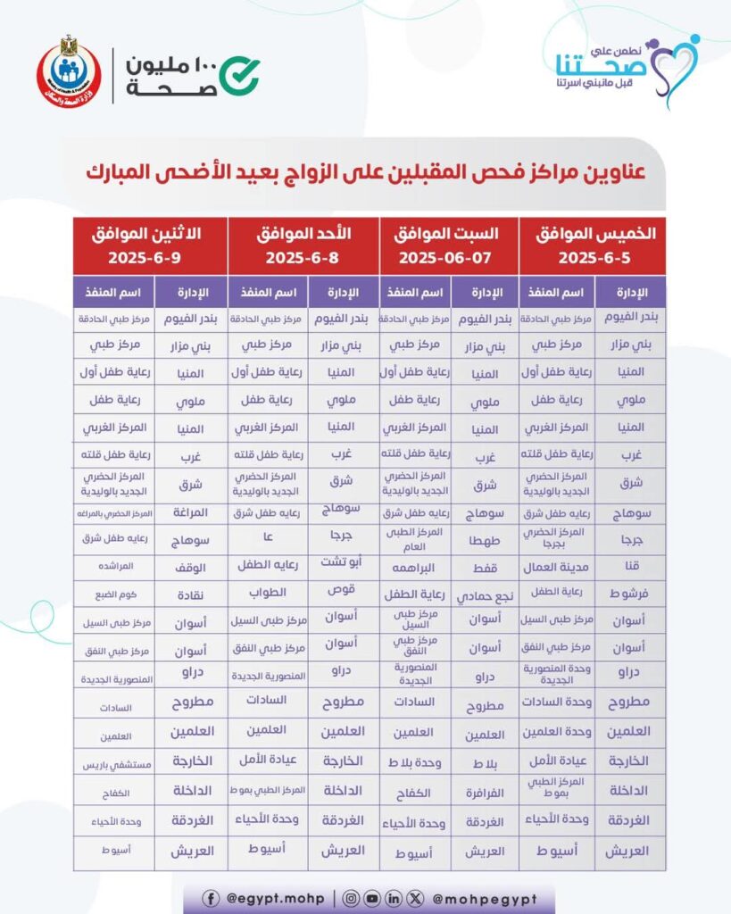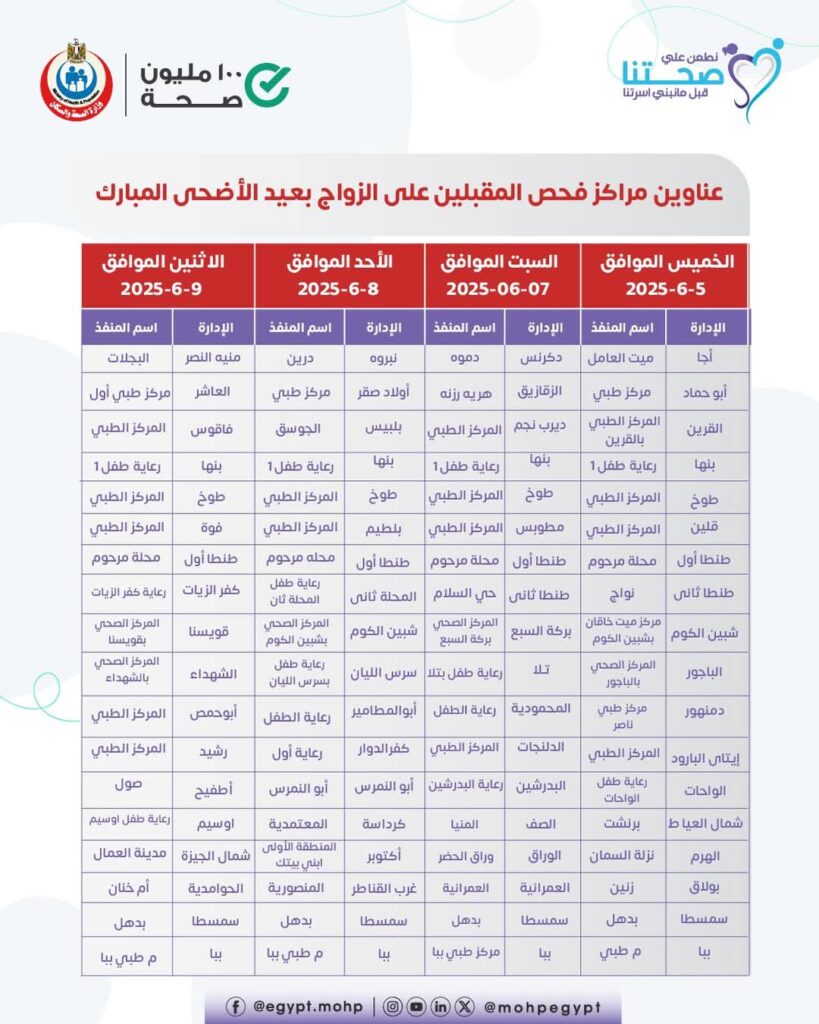 في إطار حرصها على استمرارية تقديم الخدمات الصحية خلال الإجازات، أعلنت وزارة الصحة والسكان عن تخصيص 58 مركزًا رئيسيًا في جميع محافظات الجمهورية لإجراء فحوصات المقبلين على الزواج، وذلك خلال فترة إجازة عيد الأضحى المبارك.